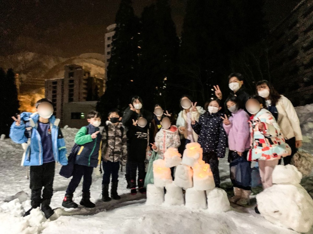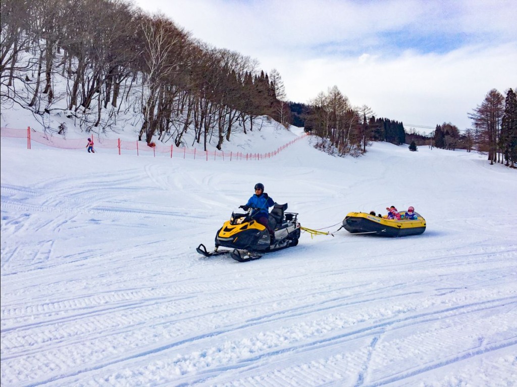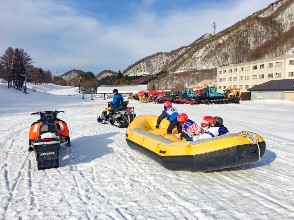 スノーモービルに引っ張られるラフティングボートに乗って、雪の上を翻弄される子どもたち。最初は「こわーい!」と少しだけ物怖じしていた子どもたちも、いざスノーモービルが動き出すと、キャーキャーと歓声をあげて大喜び。雪山のアクティビティを満喫し、大満足の表情で宿に戻ったのでした