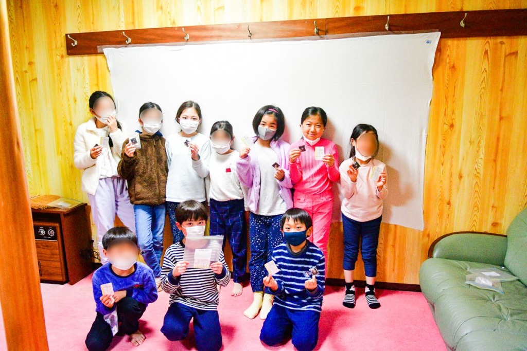 そしてこの日の夜は、スキーキャンプ最後の夜として、お楽しみタイム。みんな揃って、このキャンプ中の写真や動画をまとめたムービーを鑑賞します。自分が画面に映るたびに「ぼくがうつった!」「あそこにわたしがいる!」と大はしゃぎをする子ども達。スキーキャンプの初めから終わりまでを振り返る中で、みんなで雪遊びに大はしゃぎする様子から、検定に向けて少し緊張する面持ちまで、いろいろな姿を振り返る様子が見られました。