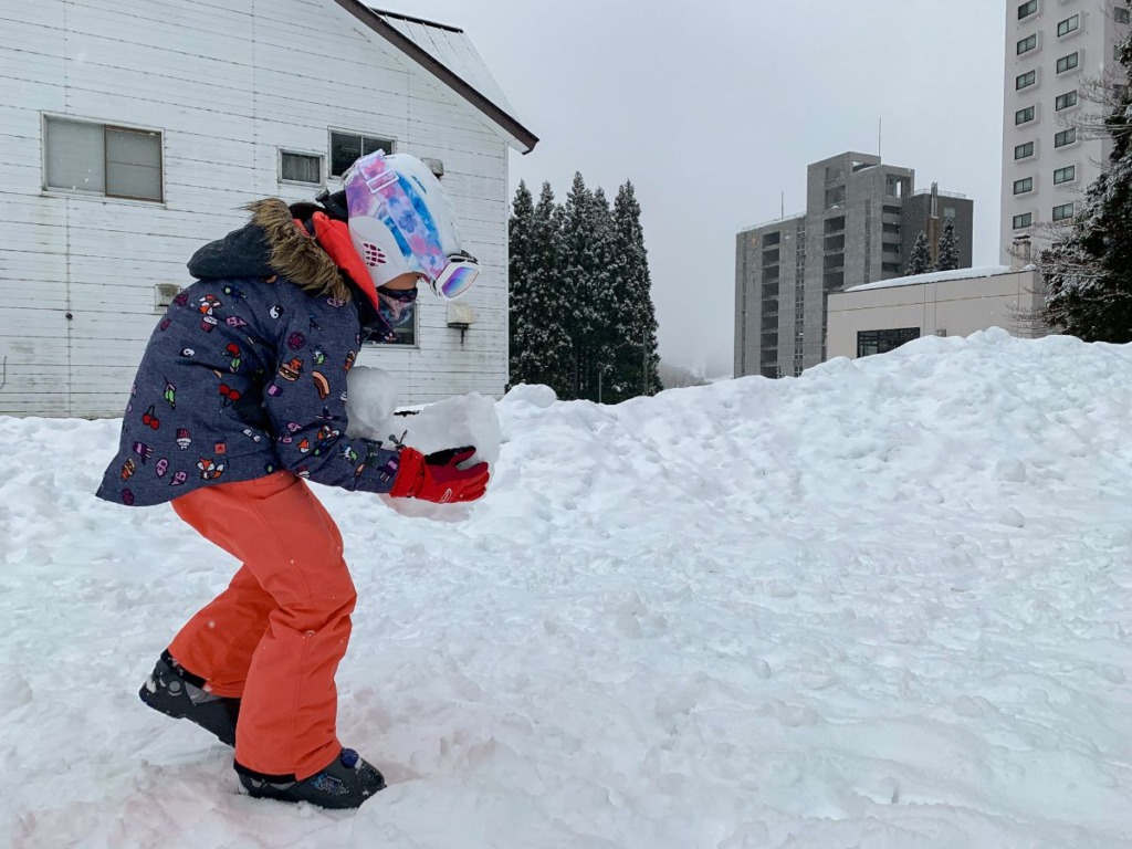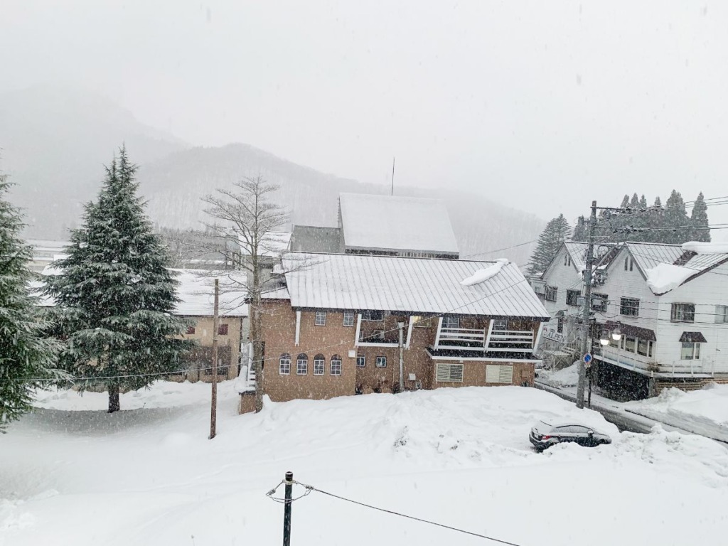 この日はかねてからの予報で、大雪が警戒されていました。目覚めて見上げた空も、これまでの4日間とは打って変わって雪模様。吹雪と言うほどではないものの、かなりの降雪量です。当初の予定では、最終日の午前中も滑走の予定を組んでいましたが、前日のスタッフMTGにより、この日は大事をとってゲレンデへ足を伸ばすことはやめ、宿の前の雪遊びの時間としました。またあわせて帰京の準備をゆっくりと余裕を持って行いつつ、出発の時刻を予定よりも早めて、大雪が帰りの交通に与えると予想される影響を最小限に止める判断といたしました。