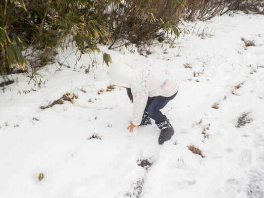 まだ雪遊びの服装にも着替えていないうちから雪に戯れて遊び始めます。