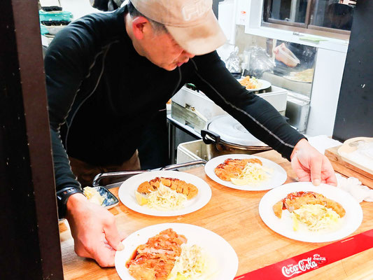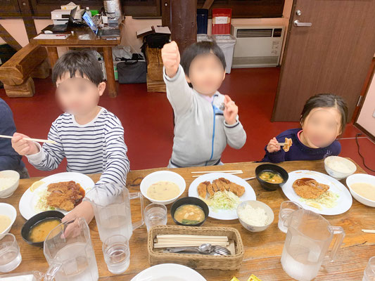 主菜にトンカツ、新潟県産のツヤツヤご飯、赤出汁のお味噌汁に加え、なぜかさらにシチューまで出してくださるというメニューの豊富さに加え、子どもから大人まで舌鼓を打つ、とびきり美味しいホテルエフ自慢の食事です。