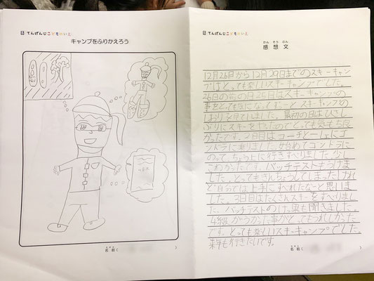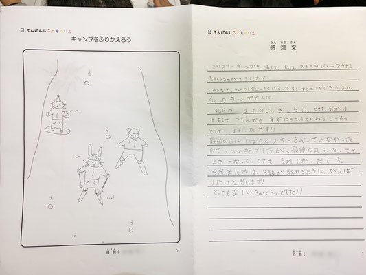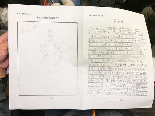 「てんげんじこどものいえのスキーキャンプ は最高の3泊4日でした。先生が面倒を見てくれて、楽しい気持ちで家に帰れます。僕の楽しいキャンプはずっと終わりません。これからも、新幹線の中で、先生に感謝しながらお菓子タイムを楽しみましょう。(ここでリーダーたち爆笑)先生たち、この3泊4日の間、本当にありがとうございました」