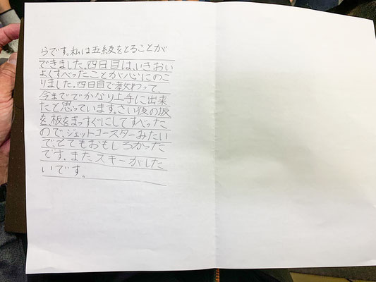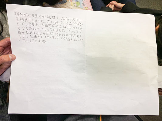 宿に残っていた子どもたちが、スキーキャンプがよほど楽しかったのか、引率をしているスタッフに向けたお礼メッセージを用意してくれており、それをみんなで読み上げてくれたのです。