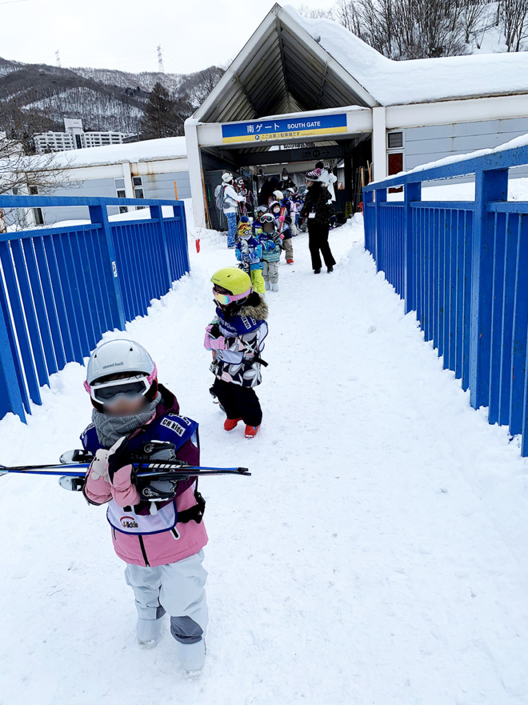 宿舎でお弁当を食べた後は、スキーウェアに着替えて早速ゲレンデへ! 小さな体で一生懸命スキー板を運びます。この日は、翌日からのスキー特訓に向けて、緩斜面の上り下りを通して板慣らし・板合わせを行いました。はじめこそ苦戦する様子も見れましたが、何度か上り下りを繰り返すうちにだんだんと感覚をつかんで行くことができたようです。2日目以降の滑走も楽しみになった瞬間でした。