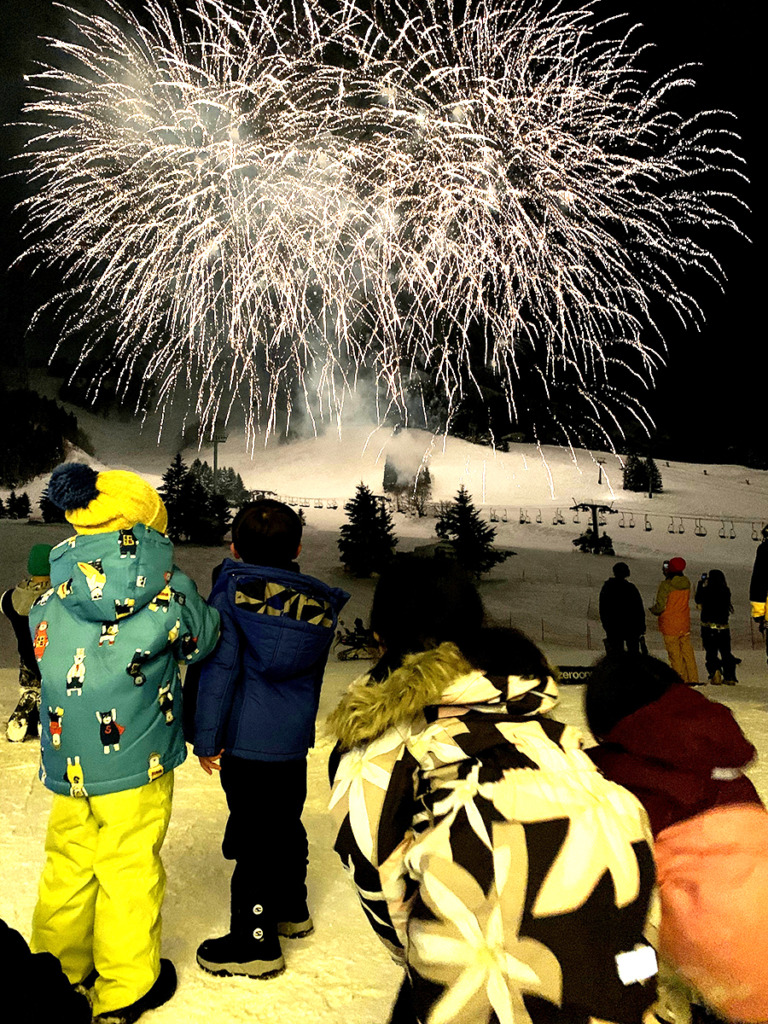 夜のゲレンデという、今まで行ったこともないような非日常空間に、子どもたちの興奮も最高潮です。いよいよ、大きな打ち上げ音が上がり、澄んだ空に大輪の花火が花開きました。