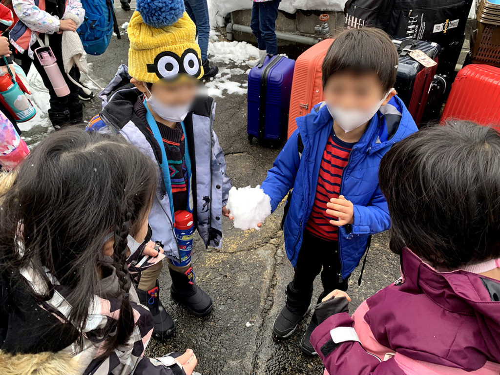 宿舎に到着するや否や、東京では見ることのない厚く積もった雪に子ども達は大喜び!ひんやりとした雪に触れて興奮している様子です。